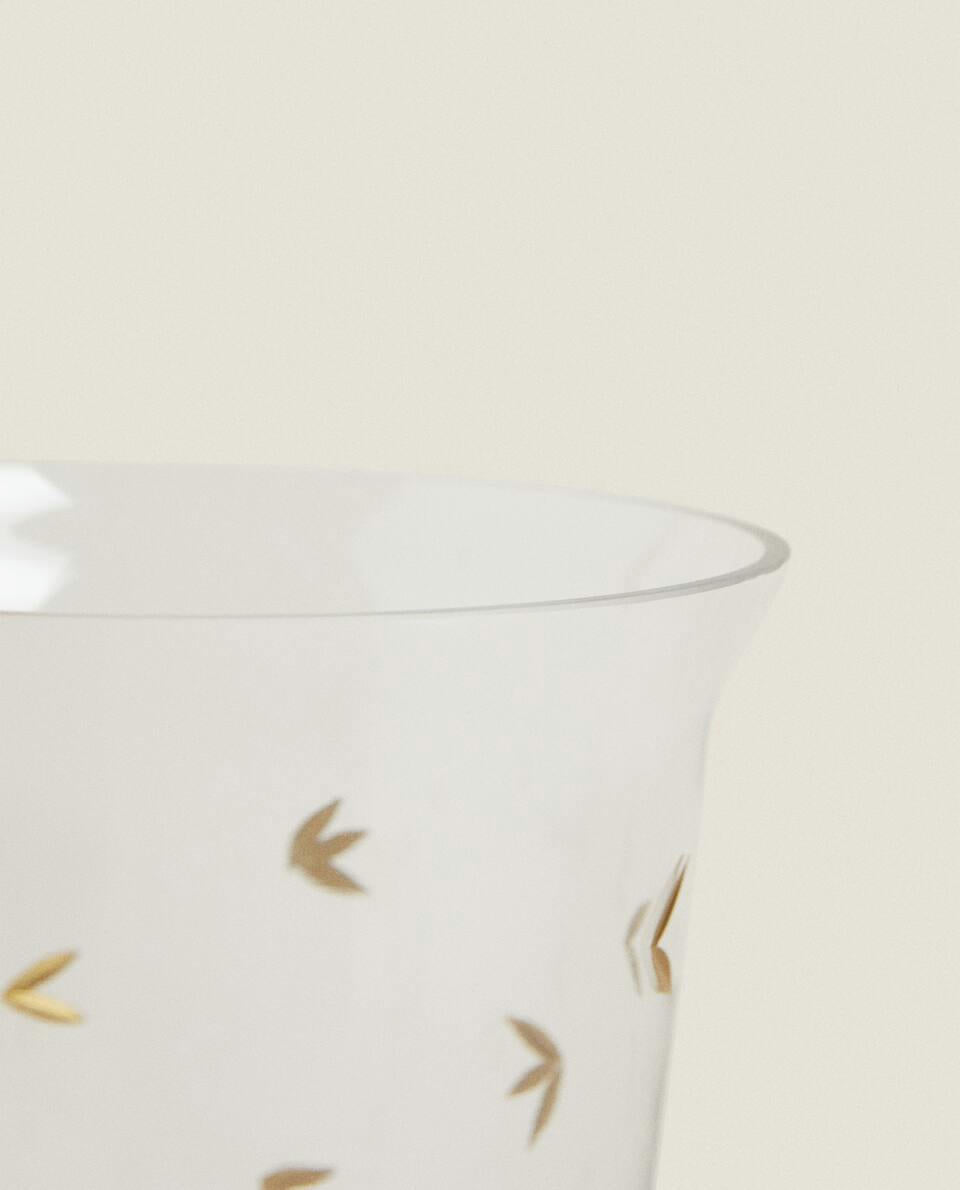 Tall glass tumbler with engraved gold leaves, for Christmas.